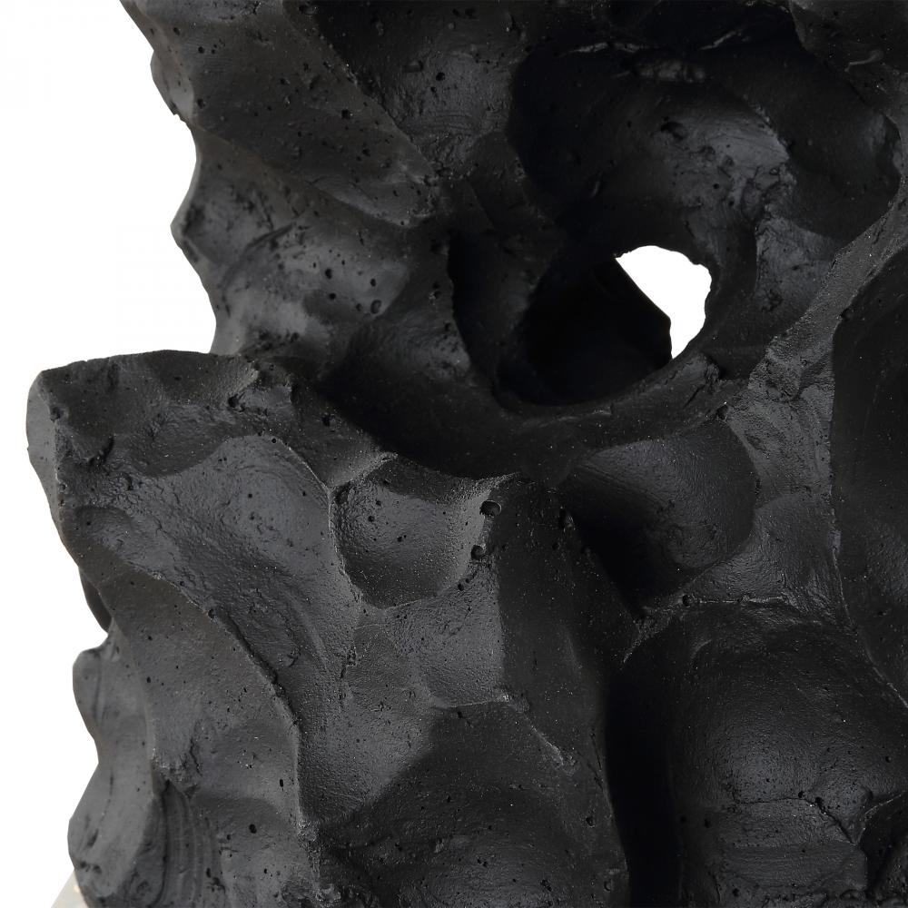 Crafted From A Black Man-made Stone, This Unique Table Lamp Replicates A Rock Sculpture That Boasts Heavy Texture With Distinctive Holes, Displayed Atop A Thick Crystal Base With Plated Antique Brass Hardware. The Rectangle Drum Shade Is Covered In A Crisp White Linen Fabric.